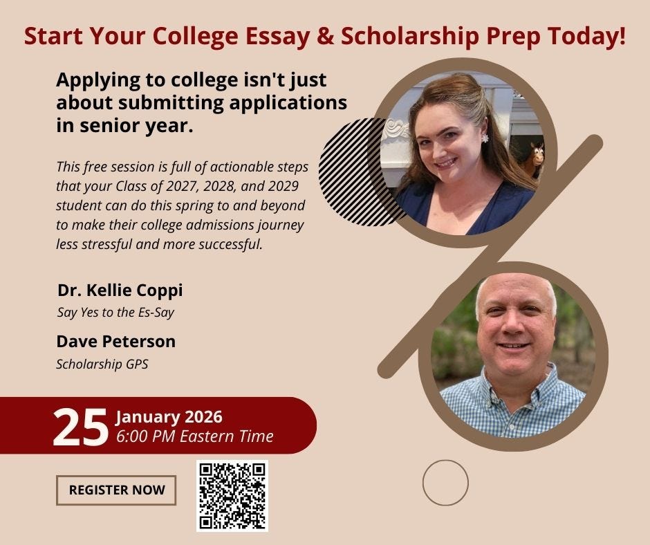 Join college essay expert Dr. Kellie Coppi and Dave “The Scholarship Coach” Peterson for this free session full of actionable steps that your Class of 2027, 2028, and even 2029 students can take this spring and beyond to make their college admissions journey less stressful and more successful.