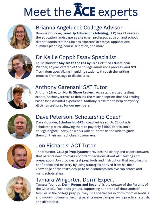 The ACE Network (Access to College Admissions Experts) is a private, subscription-based group designed to give parents direct access to trusted experts in the college preparation process. Our team includes specialists in admissions advising, essays, scholarships, financial aid, and test prep. Inside the group, parents can post their specific questions — from essay feedback to scholarship searches — and receive personalized answers directly from our experts. We also host monthly webinars to dive deeper into key topics. It’s the quality of one-on-one guidance, but at a fraction of the cost, because you benefit from expert support in a group setting.