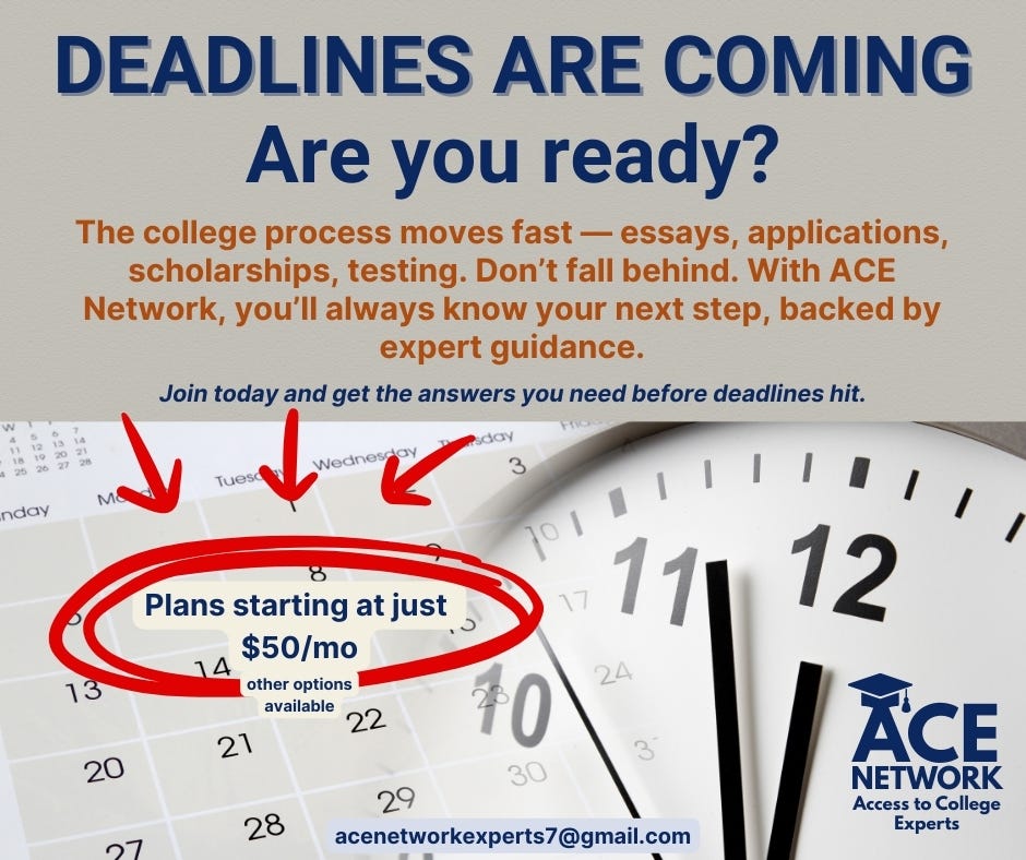 If you have a Class of 2026 or Class of 2027 student, I will be headlining the ACE Network with 5 other AMAZING and VETTED college planning experts. As a subscription service that gives you access to gems of personalized information, you can partake in this service for as many months as you’d like at a FRACTION of the cost of what a full-time college admissions advisor would cost.